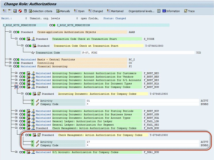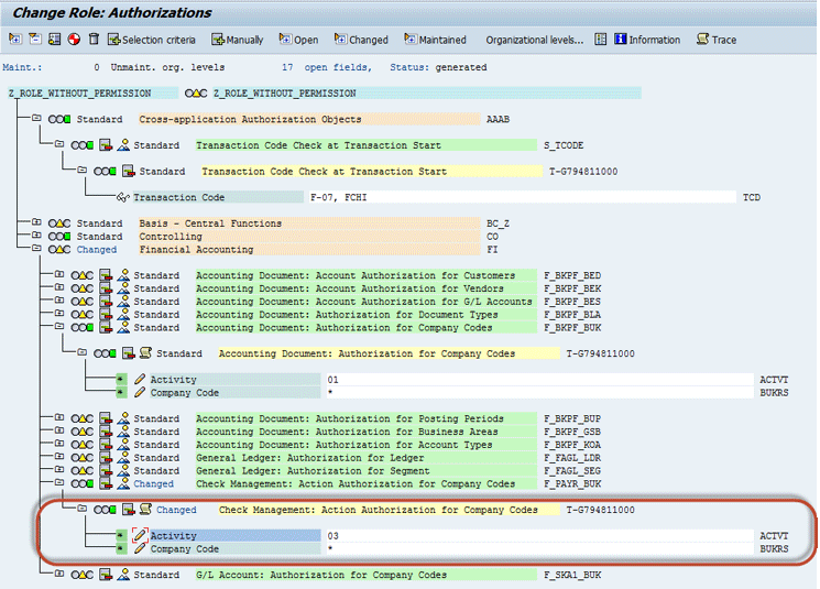 I assign two different roles to each of them. I assign Z_ROLE_WITHOUT_PERMISSION to JERRY, which has only actions but not the required permissions for making changes. As you can see in Figure 5 this role has only display permission (Activity 03) for authorization object F_PAYR_BUK. Figure 5 is displayed when you open the role authorization screen through transaction code PFCG.