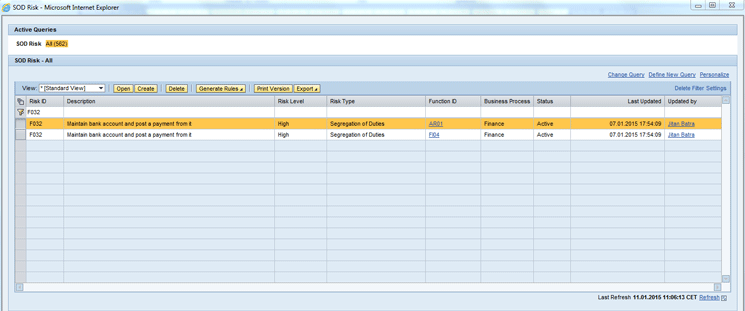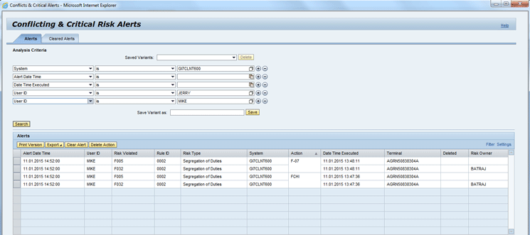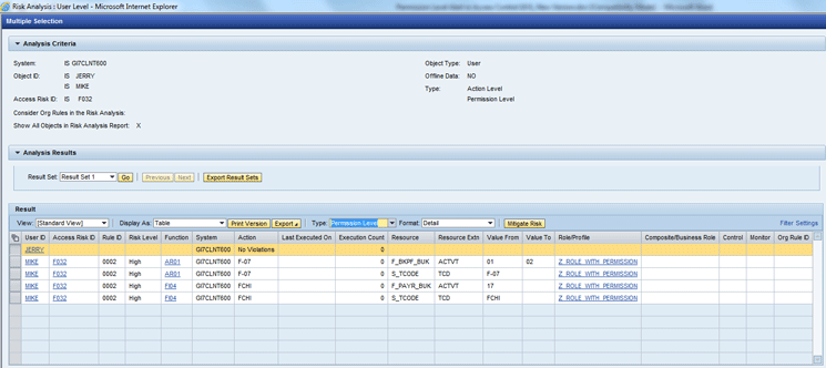 Now you have both the test data (authorization for test users JERRY and MIKE) and master data (information on access risk ID F032). Next you see the results of user risk analysis on these test users.