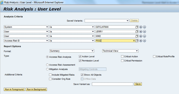 In Figure 10 enter the criteria for executing risk analysis for JERRY and MIKE. System GI7CLNT600 is the test SAP ERP system where users JERRY and MIKE exist. For User enter JERRY and MIKE in separate rows. The Access Risk ID is F032. Then click the Run in Foreground button, which opens Figure 11.