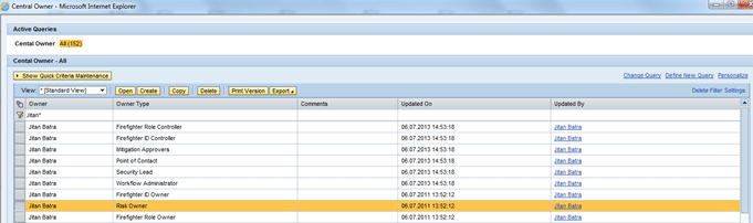 Through the Central Owner maintenance screen you can set up Jitan Batra with the Owner type as Risk Owner as highlighted in Figure 13.