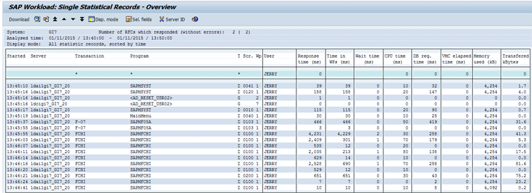 Figure 15 shows the technical transaction details performed by MIKE in the SAP ERP system. To check the STAD records for Jerry execute transaction code STAD and filter the records for test user JERRY. This opens Figure 16.