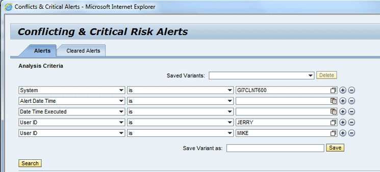 You can search the conflict and critical alerts by going to the work center Access Management. Follow menu path Alerts > Conflict and Critical Alerts > Search the Alerts. Enter the System as GI7CLNT600. Click the Search button, which takes you to Figure 33.