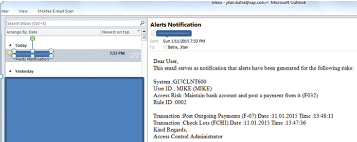 Alert functionality in SAP Access Control provides a medium to generate alert notification when a user performs critical or conflicting actions in SAP ERP or SAP NetWeaver systems.