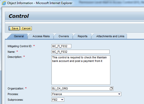 Enter the required mitigating control information in Figure 24. Select the correct Organization unit to assign the mitigating control. Select the Process Finance and Subprocess FI02. The Description area is what will be shown in the mitigation report. It should contain enough information for management and auditors.