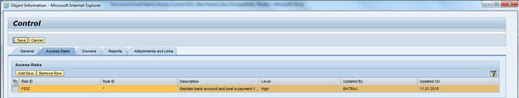 Click the Access Risks tab to open Figure 25 where you can enter the access risk ID F032. Click the Add Row button and select the access risk ID from the Access Risks value help.