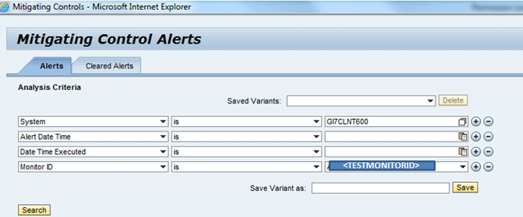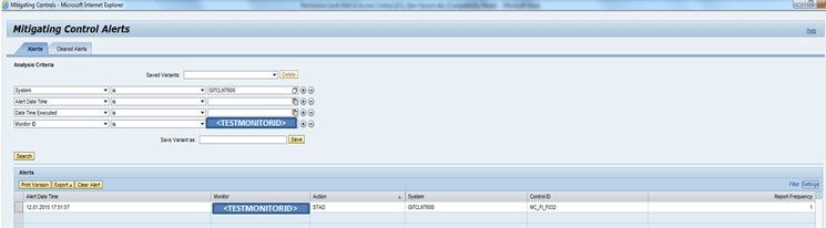 Now as the alerts have been generated, I will check them through menu path work center Access Management > Alerts > Mitigation Controls. This takes you to Figure 30. To view the alerts, enter the System details with the Monitor ID.