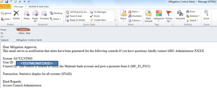 Now in the last part of mitigation control alert functionality, I address the mitigation control alert notification. This notification is generated because I selected the Send Notification check box in Figure 29. As you can see, mitigation control alerts are only generated for the control ID MC_FI_F032. Notification for the mitigation control alert goes to the approver mailbox as shown in Figure 32.