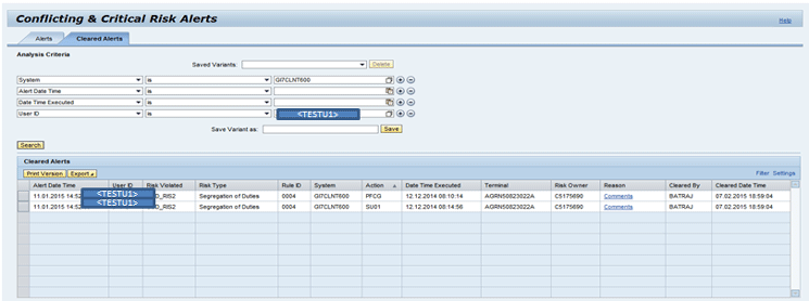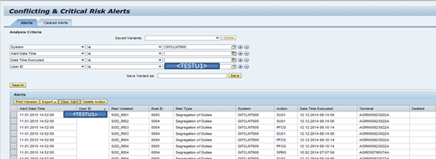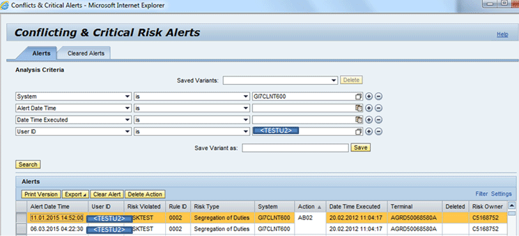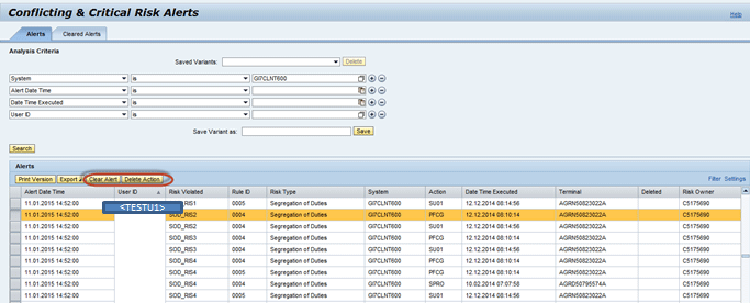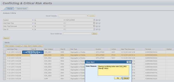 For a clear alert, user <TESTU1> has to execute both the transaction codes PFCG and SU01 in the plug-in system (GI7CLNT600). Only then is the alert for conflicting action risk (risk ID: SOD_RIS2; action rule ID: 0004) generated.