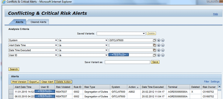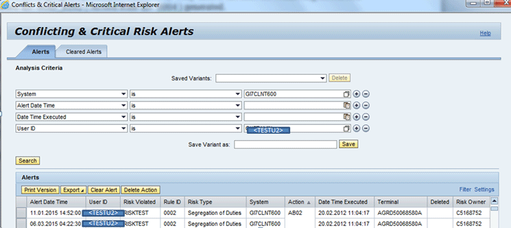 Search the conflict and critical alerts again by going to the work center Access Management. Follow menu path Alerts > Conflict and Critical Alerts > Search the Alerts. Enter the System as GI7CLNT600 and the User ID as <TESTU2>. Click the Search button to go to Figure 37.
