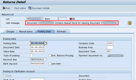 Enhanced return processing includes a few new features. For example, because the cash desk is closed at the end of each day, if any check returns are applied to those payments, the system displays the details for processing through a return lot. Use transaction code FP09 to post a return by giving a return lot name. Figure 2 shows the error while posting the return. In the example in Figure 2 the return could not be processed because the payment document #1***69 contains items for the clearing document #17***6. This error occurs when the return is not allowed to be posted because the payment has been processed through a cash desk.