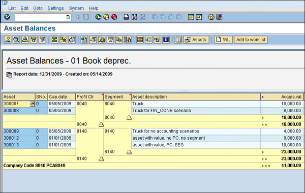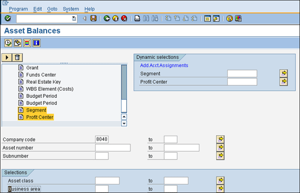 Use transaction AR01 or follow menu path Accounting > Financial Accounting > Fixed Assets > Information System > Reports on Asset Accounting > Asset Balance > Balance Lists > Asset Balances (Figure 2). This shows the selection screen from the Asset Balances report. Click the dynamic selections icon (the third icon from the left under Asset Balances) to view the two attributes, which you can then specify so that the report returns data only for the appropriate set of segments or profit centers.