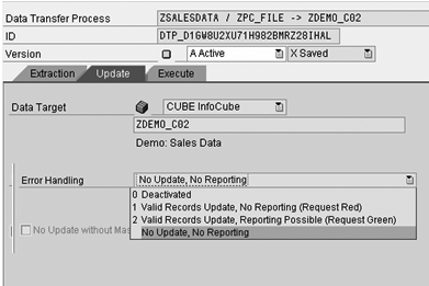 Identifying and trapping erroneous records during the ETL process is important to a data warehouse. Features that enable efficient identification and post processing are equally important. For instance, in one option the system suspends the ETL process when it identifies an erroneous record. In another option, the ETL process isolates the error records while continuing to process the correct records for further reporting. In SAP NetWeaver BI 7.0, you govern the ETL process using various options while defining a DTP.