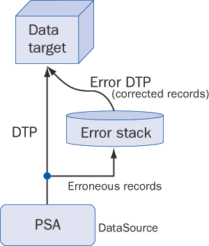 Figure 3 shows the positioning of an error stack in the data flow using DTP. When a DTP loads the data from the PSA (e.g., DataSource) to the specified data target, the system checks the records for the errors during the flow. These checks can either be standard system checks, such as master data checks, or custom checks that you code in the transformation.