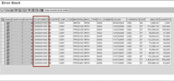 To see the error stack, click on the Error Stack button. Then select the data package to display the error records. In Figure 6, you can see the 13 erroneous records for customer 1000. Double- click on the status icon