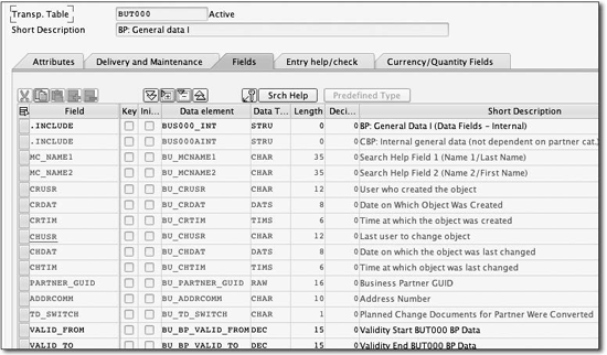 The final feature of the table that we’ll mention is the CI include for customer attributes. This include—called CI_EEW_BUT000—is delivered by SAP for enhancing the business partner with new attributes that are of a 1:1 relationship to the business partner. In Chapter 3, we’ll explain how to extend the SAP CRM business partner.