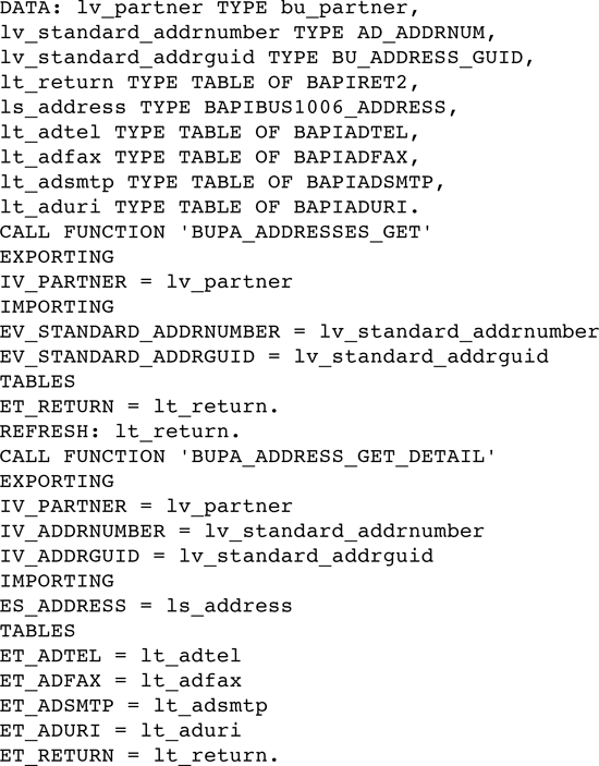 Listing 4 shows a typical example for retrieving the address data for a given business partner.