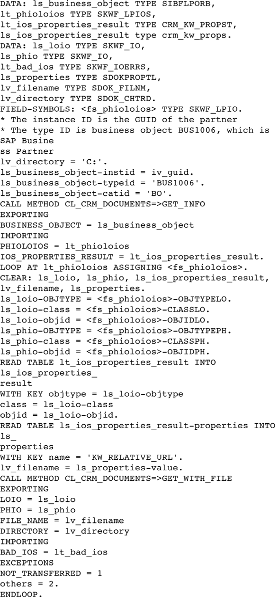 Listing 6 is an example to retrieve a list of documents for a business partner and then retrieve each individual document. This example calls the method CL_CRM_DOCUMENTS_API=>GET_WITH_FILE to download them to the end-user’s PC directly via the SAP GUI. You can also call the method GET_WITH_TABLE to store the document into an internal table instead.