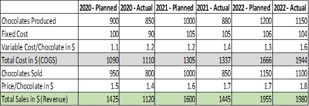 To explain these 12 FP&A standard performance reports, let us take a company that makes chocolates. The table below shows the financial details of the company for the last three financial years (2020-2022) where the 12 standard or commonly used FP&A reports will be derived or explained.