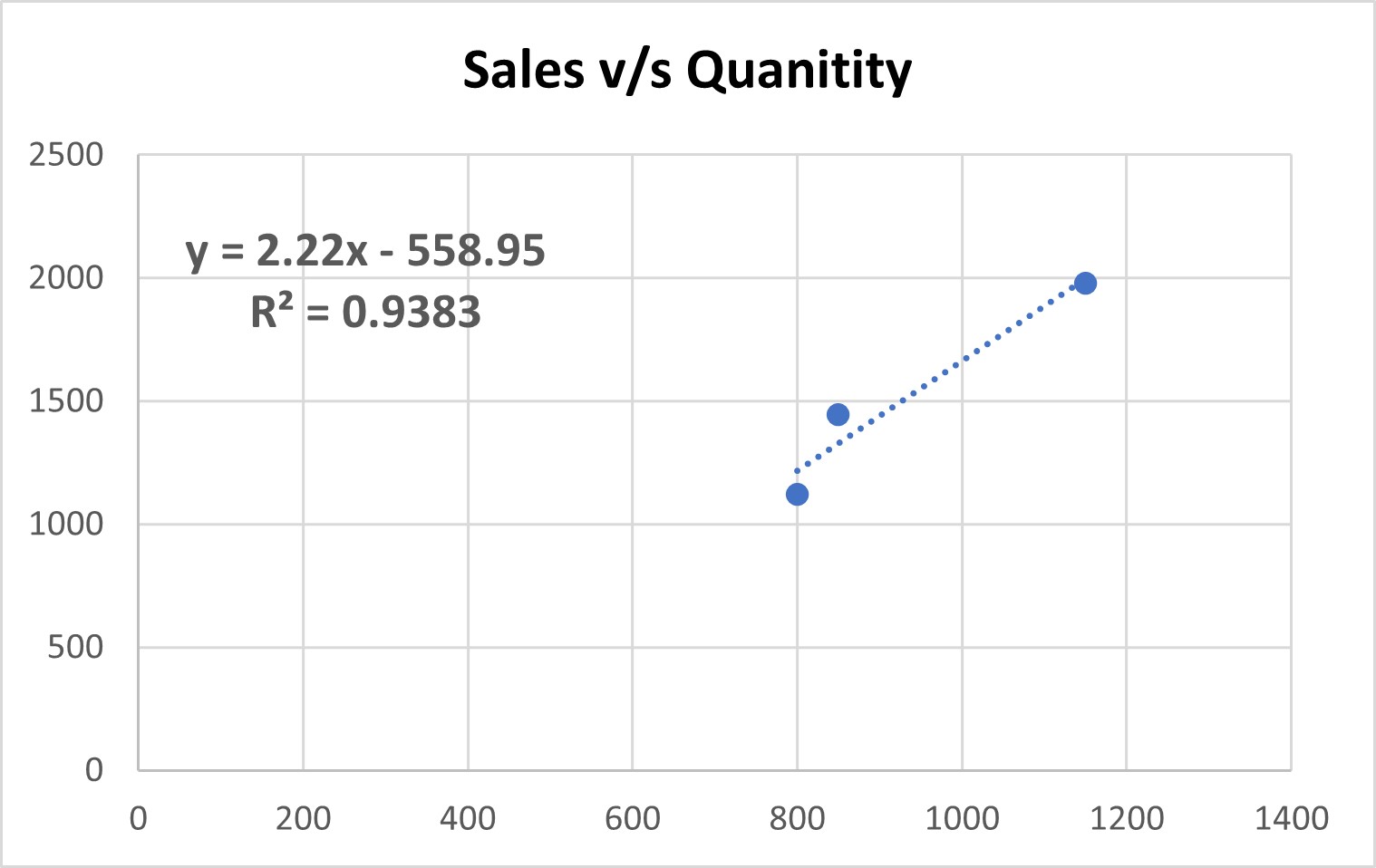 So, in 2023 (the future period), if the expected quantities of chocolates sold is 1,225, then the predicted sales or revenue will be: 2.222 * 1,225 - 558.95 = $2,163.