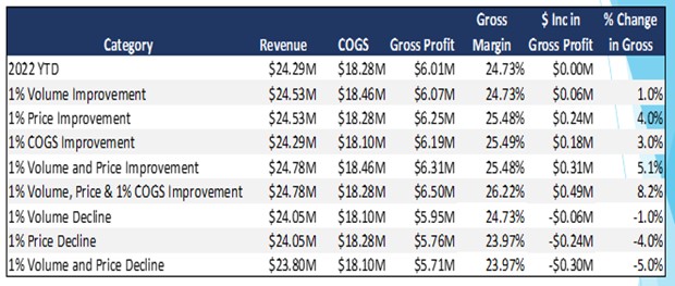 Sales or revenue is primarily dependent on two main variables: quantity and unit price. PVM (Price Volume Mix) Analysis helps to assess the impact of changes in prices, volume change, or a combination of both to the revenue. In the below example, a 1% increase in product price is four times more impactful than 1% increase in volume.