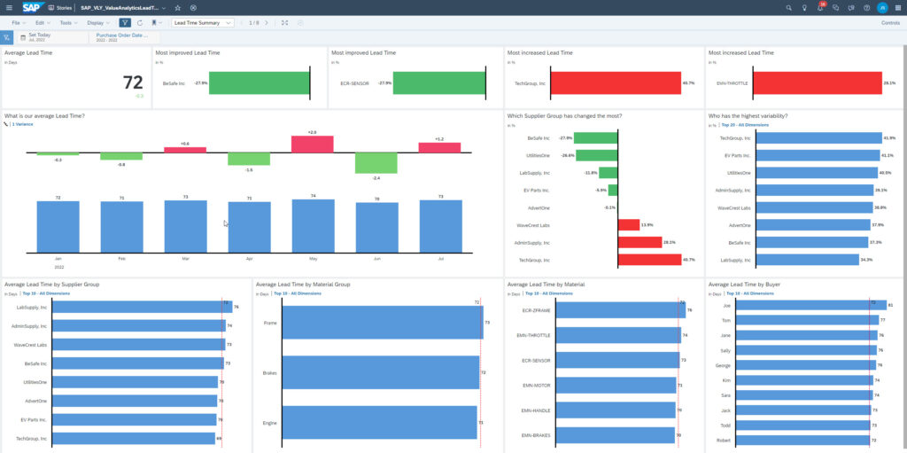 Lead-Time Variability provides a visual overview on the lead-time over time broken down by a dynamically selected dimension. For example, Lead-Times by month can be viewed for all the materials one is responsible for. Because one can view all the materials next to each other, one can quickly recognize trends and spikes and take action accordingly.