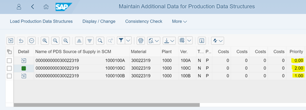 Since the Production Planning and Detailed Scheduling (PPDS), which was part of SAP-APO, is integrated with S/4 HANA, SAP functionality to assign priorities for different PPDS ‘Product data structures’ (which is called Production versions in S/4 HANA) should resolve this. This saves much time for users and relieves the master data team from their efforts to create complex load files for routing alternate sequences. An example is provided below where Production versions 100A, 100B, and 100C are provided priorities 0, 1, and 2 respectively, where 0 is having the highest priority.