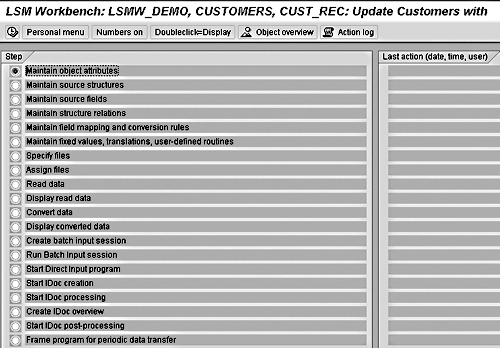 The main screen of LSMW provides wizard-like step-by-step tasks, as shown in Figure 3. To complete your data conversion, you need to execute these steps in sequence. Note that these steps may look different depending on your Personal menu settings.