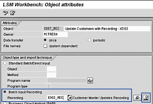 In this demo example, you’ll be updating customer master records with the help of recording transaction XD02. Choose the button Batch Input Recording and click on the recording overview icon to record the R/3 transaction.