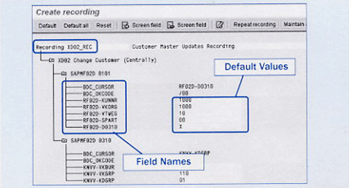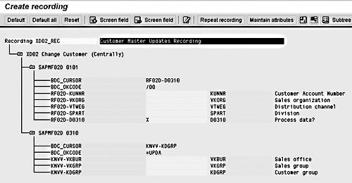 The transaction-recording process stores field names in a technical format. If you press the F1 key on individual screen fields and then press the F9 key, the system displays technical names. You can then replace the technical names with descriptive names. Double-click on the field RF02D-KUNNR, enter the name as KUNNR and the description as Customer Account Number, and remove the default value. Double-click on all other fields with default values and make appropriate changes. Once you have made changes, the recording overview screen looks like what you see in Figure 6.
