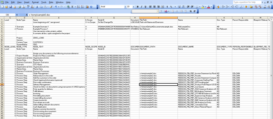 When you launch Excel and open the newly downloaded template, you’ll notice that it looks considerably different from the one for the structure upload. Figure 12 shows the template used for uploading documents to a Solution Manager project.