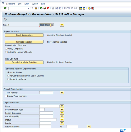 Solution Manager prompts you for selection criteria. Click the execute icon and the transaction is filled with the defaults. You see all the documents assigned to the project. Figure 19 shows the input selection options.