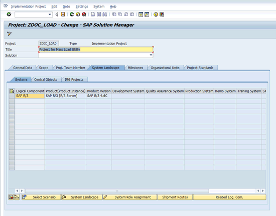 Next, add the logical components that are used in your project structure. The logical components must be assigned to the project header prior to loading any structure elements that reference the components. Figure 2 shows the System Landscape tab with the SAP R/3 component assigned. This is the logical component that is referenced in the same Excel template that will be loaded into the system.
