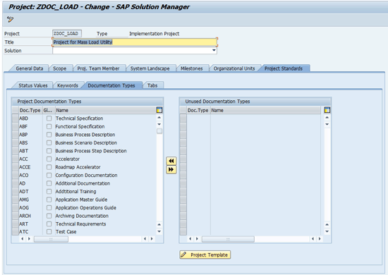 Next, confirm that you have the project document types you need. When loading documents into Solution Manager, one of the key attributes is the document type. Document type assignments are made on the Project Standards tab. On the Project Standards tab click the Documentation Types subtab (Figure 3).