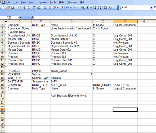 Figure 5 shows the Excel template. At first glance, it may appear that it is a lot of technical stuff that doesn’t help you get the data into the system in the way that you want. In the next few paragraphs I’ll show you how to navigate and take advantage of this template to load your own BPH into Solution Manager.