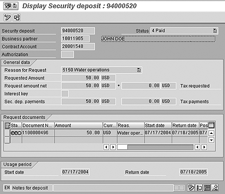 FI-CA's security deposit functionality can be used to manage cash and non-cash security deposits — payment guarantees or a letter of credit, for example. Security deposits have a status of requested, received, or paid. These statuses allow the deposits to be managed. Each security deposit is created with a "valid from" and "valid to" date, which defines the validity period and also influences the interest calculation dates (Figure 2).