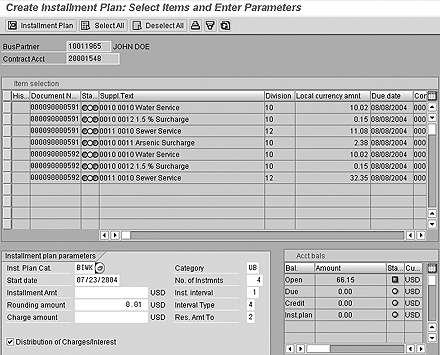 The FI-AR module does not provide functionality for the management of installment plans. In FI-CA, installment plans can be created for outstanding receivables for different installment plans, i.e., weekly or bi-weekly installments. The old receivables are then cleared and new receivables are created. This allows for easy tracking of installment line items. You can charge additional costs or calculate interest on the installment items upon creation. In Figure 3 on the next page, a bi-weekly installment plan with four installments is created for all open items of a customer. The system then takes all open items and divides the total amount due into four installments with new due dates.