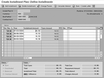 In this example, an installment plan with four installments is created for the total amount of $66.15 (Figure 4). The starting date for the first installments is 07/23/2004. The next installment due dates are based on the interval type, bi-weekly in this case.