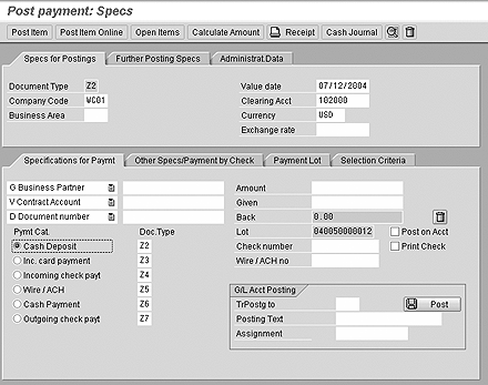 One of the main features in FI-CA is a robust cash desk component (Figure 5). With this component, you can manually post and assign payments at a cash desk. You can process the following payment types: