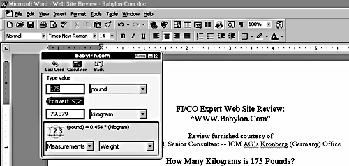 - Lets you do all sorts of measurement and currency conversions with one mouse click. Figure 4 shows an example of that. I merely typed the words "175 pounds" into my Microsoft Word document, held down the SHIFT key, and used the right-mouse button while my mouse cursor was over the words — and the Babylon.com viewing program is automatically launched, along with the information that 175 pounds equals 79.379 kilograms.