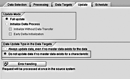 7. Turn on master-data validation when loading data. This function checks against existing master data when loading transaction data. If a transaction comes through for which there is no valid master data, the system marks the transaction with an error. This setting, Do not update data if no master data exists for a characteristic, is in the InfoPackage on the Update tab (Figure 1).