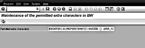 8. Maintain the permitted characters table. BW checks for permitted characters and only allows certain ones into the system. This table can be accessed in BW customizing under Business Information Warehouse> General BW Settings>Maintain Permitted Extra Characters, or via transaction code RSKC (Figure 2).