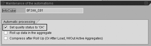 12. Consider having the data-quality manager manually update the data-quality status (ODS, InfoCube) to green instead of having the status set automatically after a data load. This can be set from within the InfoCube Maintenance area, menu path Environment>Automatic Request Processing (Figure 4). To set it as manual, do not select the option Set quality status to OK.