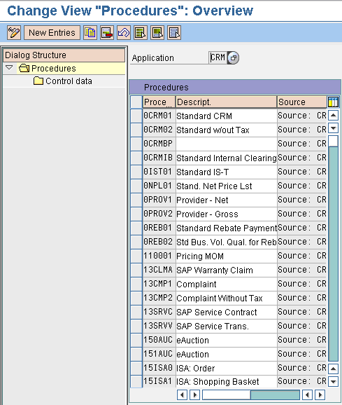 To define a new pricing procedure, click the New Entries button and enter the required information in the screen that appears (Figure 2). To define or update the attributes of a pricing procedure, highlight the appropriate entry and double-click the Control data folder on the left side of the screen. Figure 3 shows the control data (e.g., condition types and validity period) for a particular pricing procedure, 0CRM01 — Standard CRM.