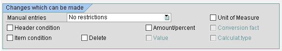 Pricing conditions can be defined as an agreement on prices, discounts, or freights based on certain metrics (e.g., business partner, product, and product group) and apply to a defined period of time. The system allows you to define the kind of data (e.g., product, product group, customer, or customer group) that pricing conditions can be created for by selecting a condition type and a condition table. Refer back to Figure 5 to see where to make these settings (note that Figures 15 and 16 are pulled from Figure 5). Depending on how you configure condition types (Figure 15), some elements, such as amount and unit of measure, can be changed (Figure 16).