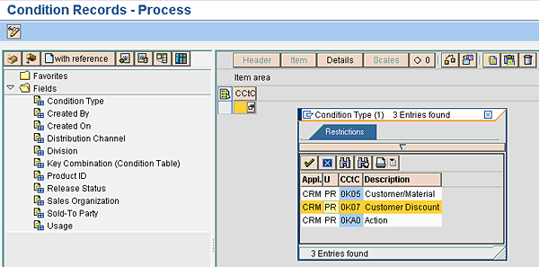 Condition records act as a repository for condition-centric data and determine input and output values for a determination process. Condition techniques in SAP CRM and SAP ERP are based on condition records. The output values (price, markup, and discount) are based on defined input values (business partner, business partner group, and product). The values are valid for a defined period of time and you can maintain them based on a value scale.
