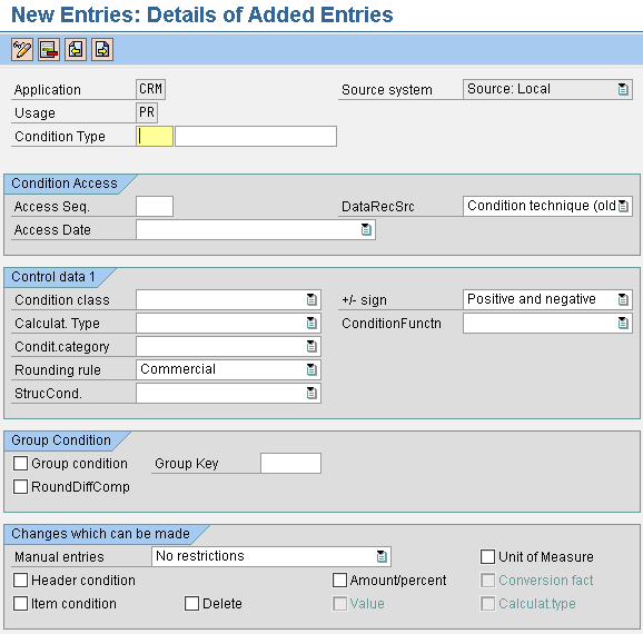 Condition types are the characteristics, features, and attributes of a condition. They define the categorization and utilization strategy of a condition. Condition types can be defined by following IMG menu path Customer Relationship Management > Basic Functions > Pricing > Define Settings for Pricing > Create Condition Types (Figure 4). To create a new condition type, click the New Entries button and enter the required information in the screen that appears (Figure 5).