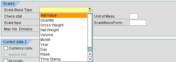 In Figure 6, you see that you can set every condition type’s automatic surcharge, automatic discount, prices, or taxes. This allows you to assign a condition type to every type of price, tax, discount, or surcharge. In addition, you can define the calculation type (e.g., percentage, fixed amount, volume, gross weight) and scale base type (e.g., net value, quantity and gross weight) for condition types, as shown in Figures 7 and 8.