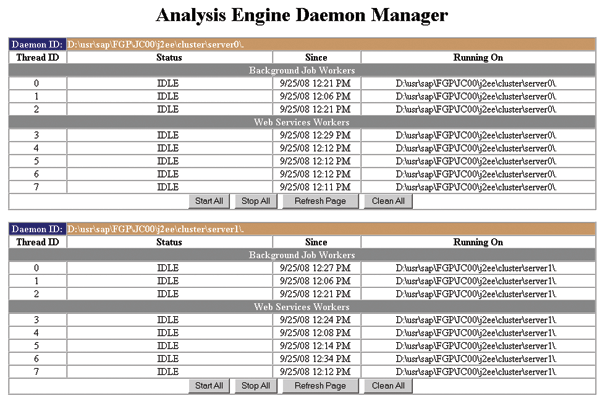 https://:/sap/CCADStatus.jsp. Log in as the administrator user and the system displays the status of the available threads on each server node of your application server (