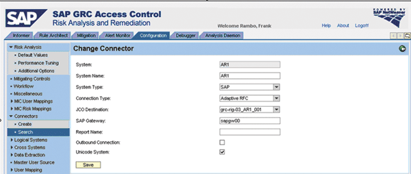 Then, for each target system, maintain pre-installed Java Connector (JCO) destinations in your application server as explained in the installation guide available at https://service.sap.com/instguides. Apply the JCO pool parameters as documented in SAP Note 1121978. Log on to RAR, navigate to Configuration ? Connectors ? Create, select the JCO destination, and add the remaining fields (