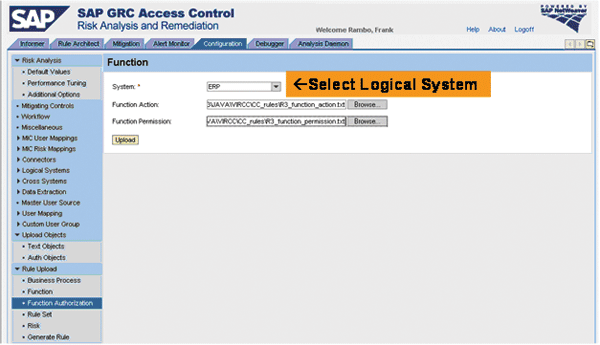 Step 12. Upload SAP GRC standard rule set text files. With the installation zip file comes a number of text files containing definitions and descriptions of business processes, functions, and risks for SAP back-end systems of different types (e.g., Basis, R/3, HR, Advanced Planning and Optimization [APO], Supplier Relationship Management [SRM], and Customer Relationship Management [CRM]). Upload these files in Configuration ? Rule Upload. For each back-end system type, two files exist that define functions in terms of actions and permissions. Upload these two files and select the target system connector or respective logical system for which you want to define the functions (